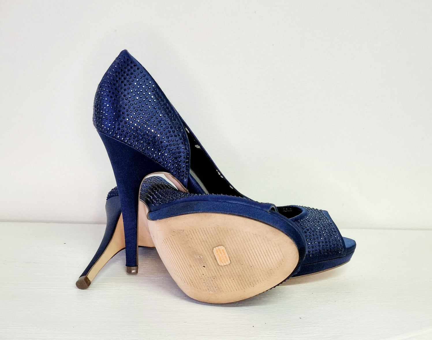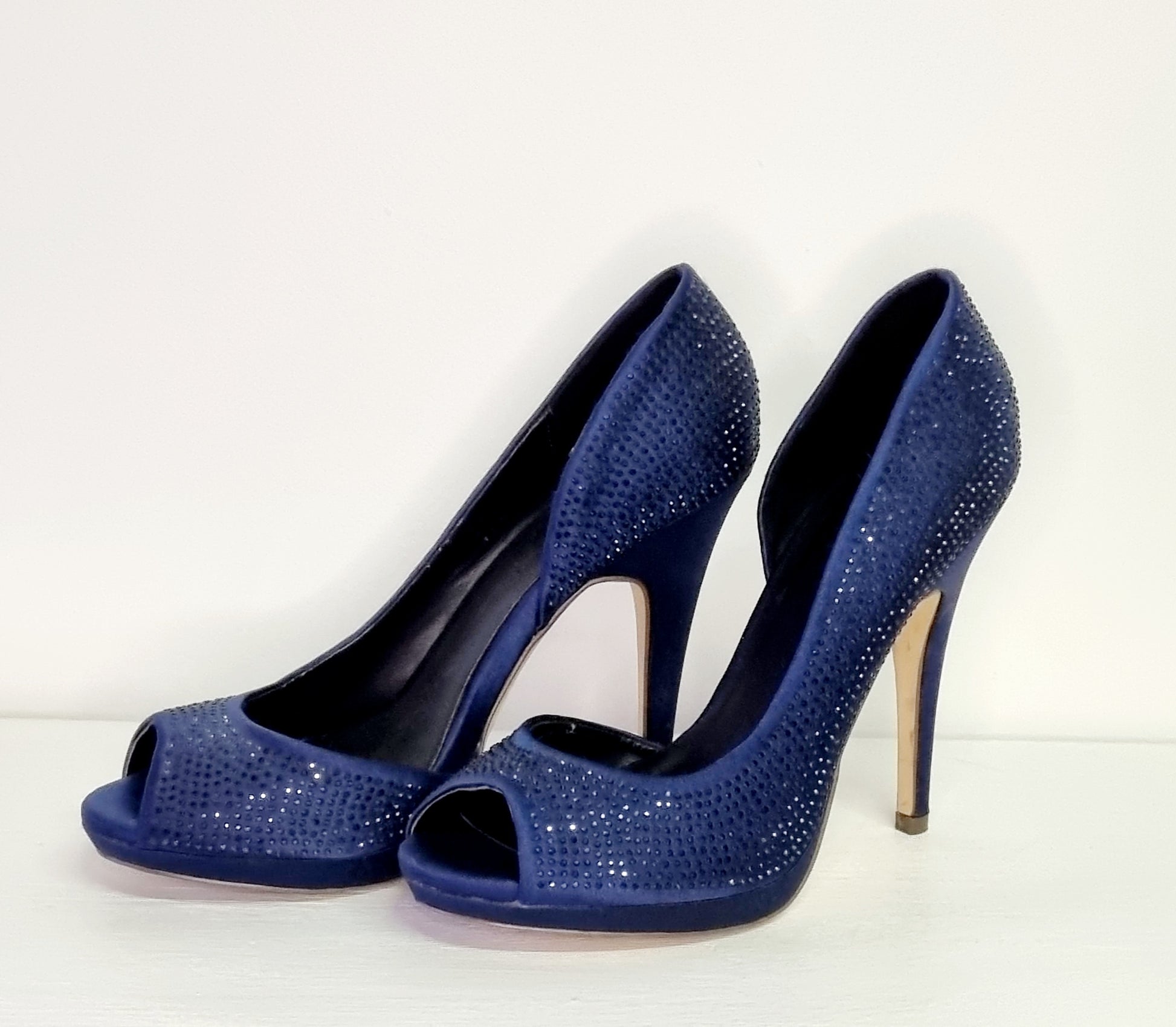 Perfect for an evening or day out. Complete and match your closet with this addition of dark blue beaded court stiletto heels.