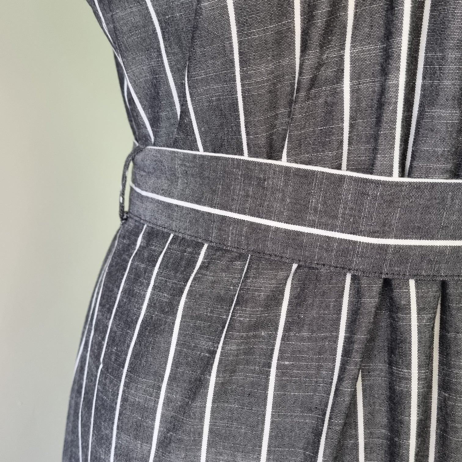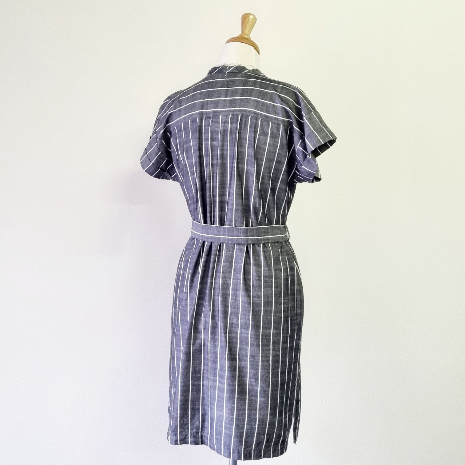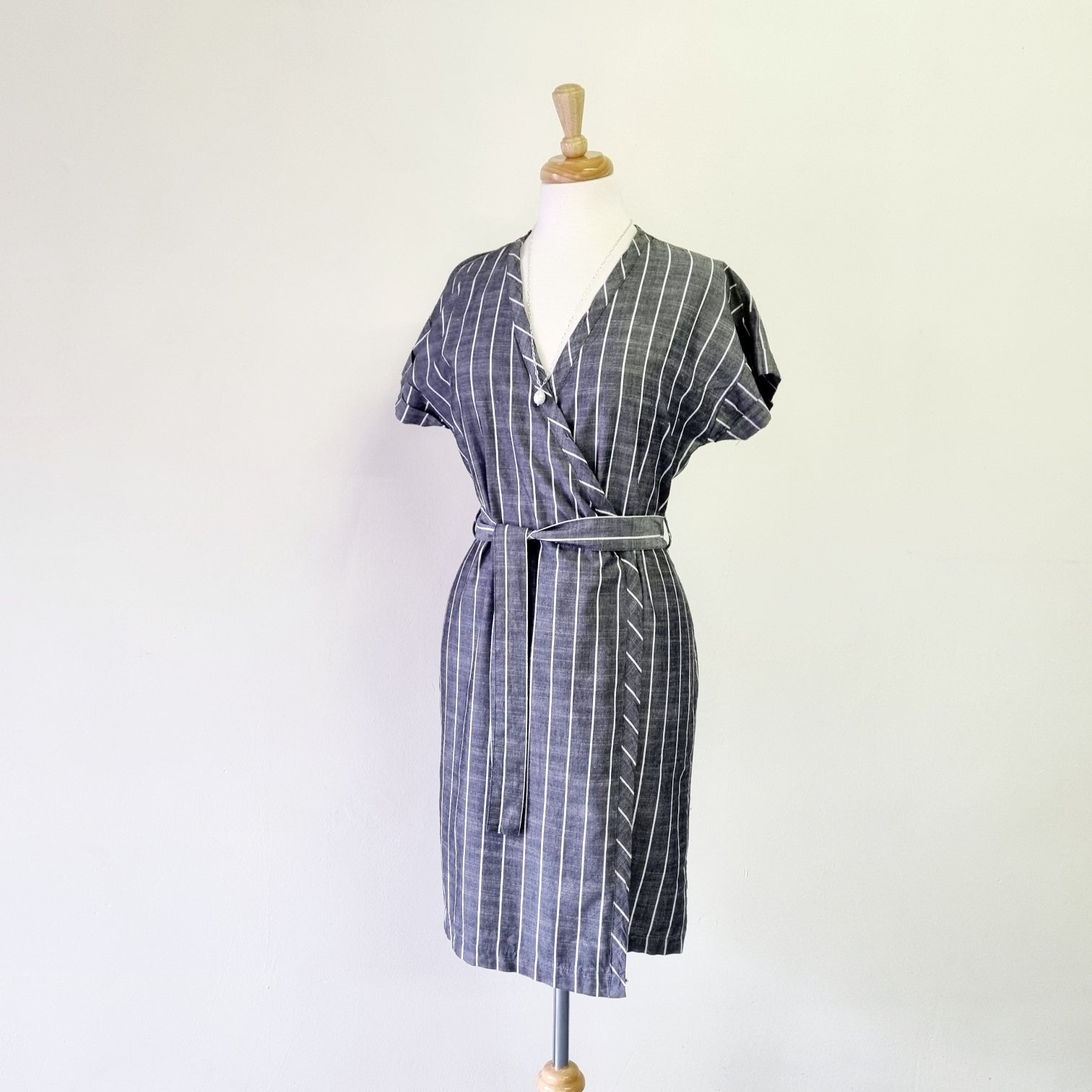 Grey & white short sleeved wrap waisted striped midi dress with belt.