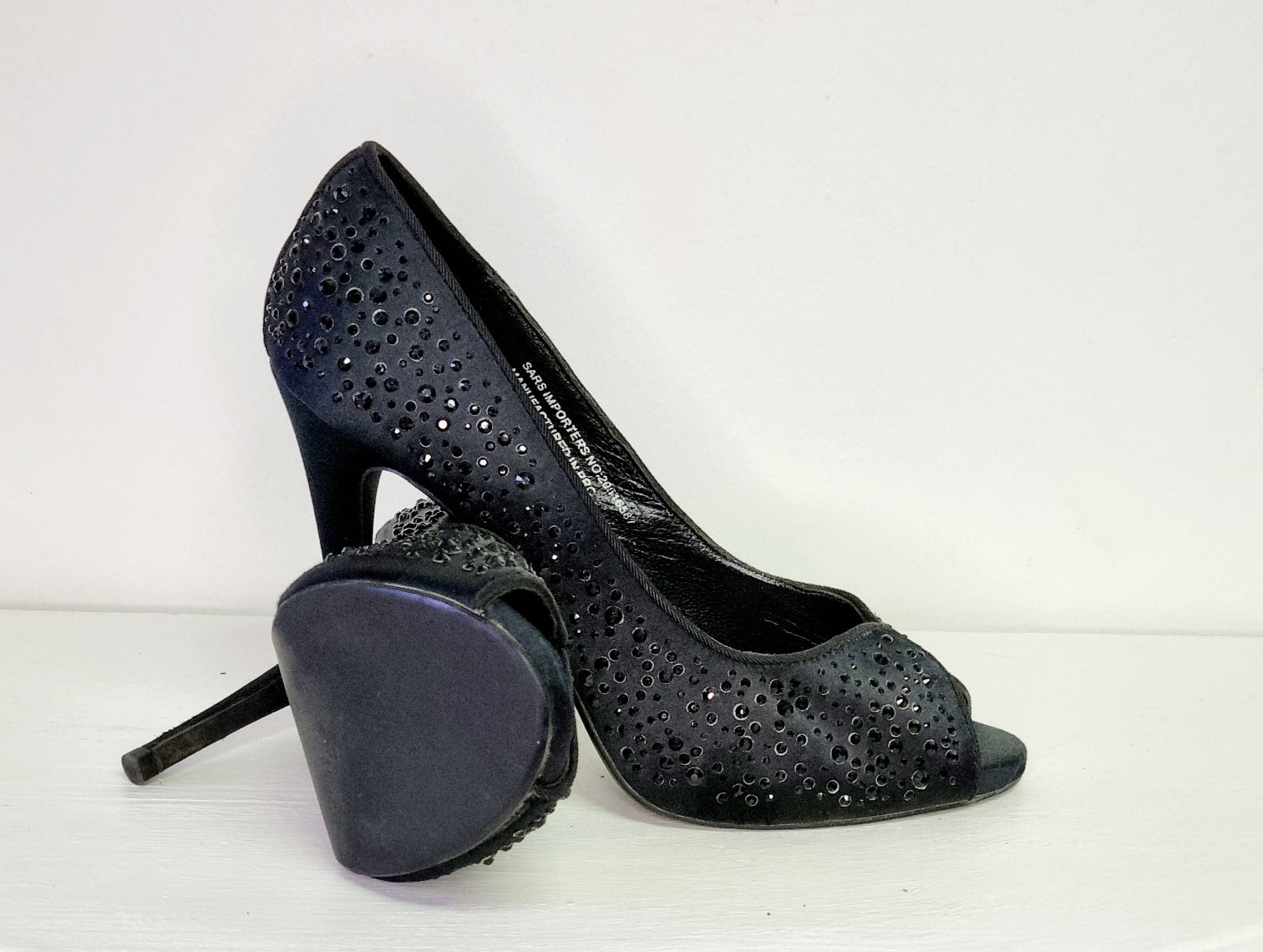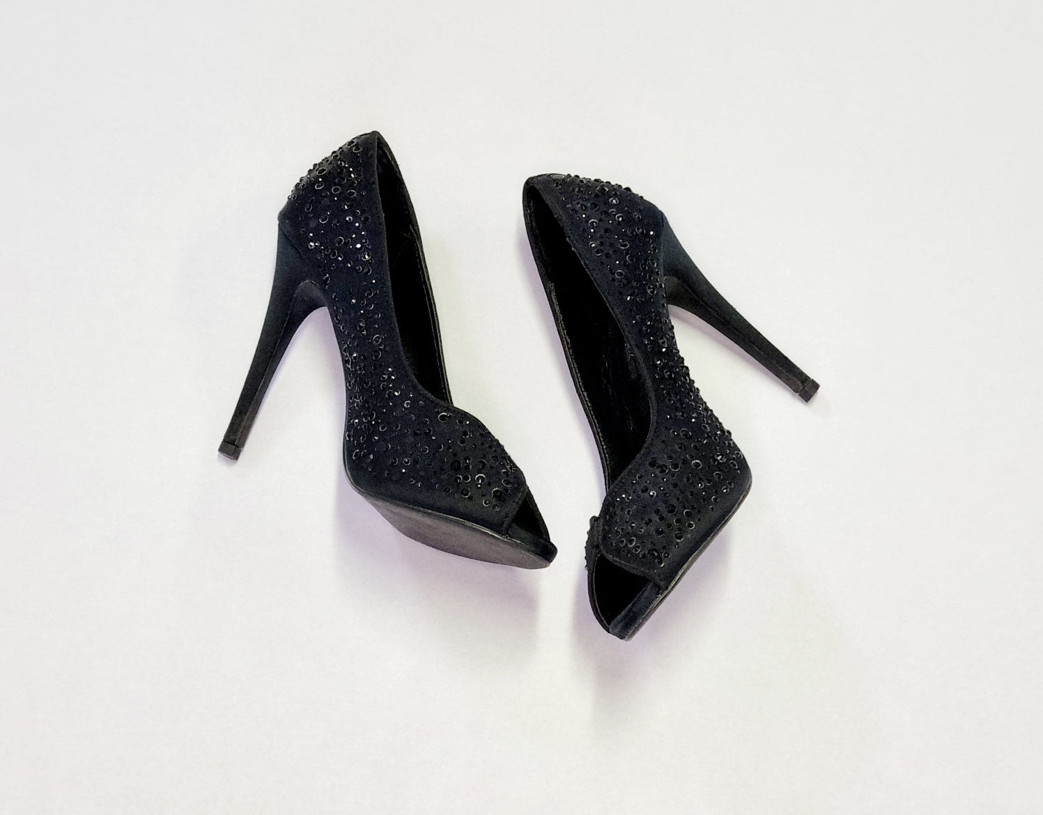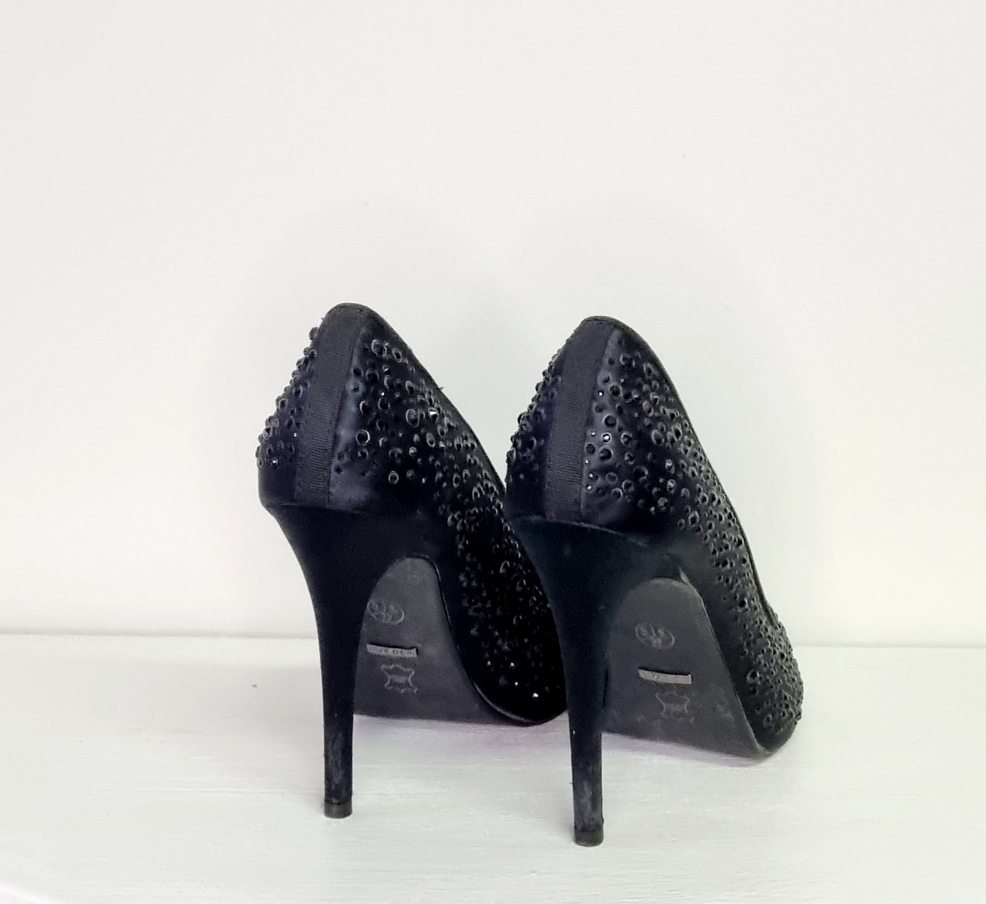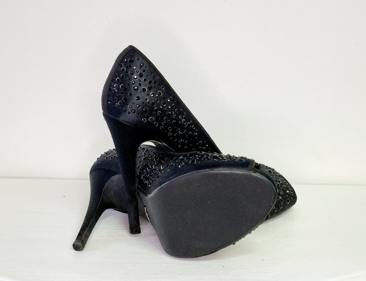 Add this timeless, yet classic and sassy black beaded open toe stiletto heels to your closet.