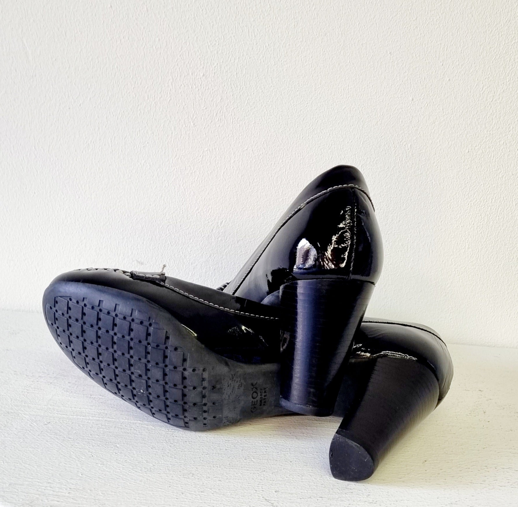 International Patent "The shoe that breathes", GEOX provides a combination of extraordinary cushioning and outstanding breathability, keeping you comfortable and light on your feet. These vintage signature black patent leather heeled closed-toe pumps, with white stitching and brown buckle, is a sophisticated feminine piece of footwear that delivers the utmost comfort for effortless walking on heels, perfect for work and special events.