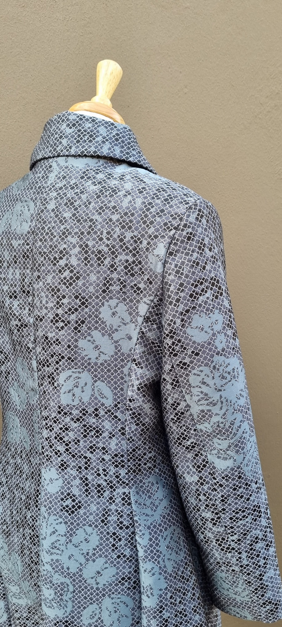 An unusual lightweight soft turquoise and grey lined Jixi coat, with fabric covered buttons and pockets. This statement coat can be worn with any of your favorite closet items, and pairs beautifully with black for those fresh winter days.
