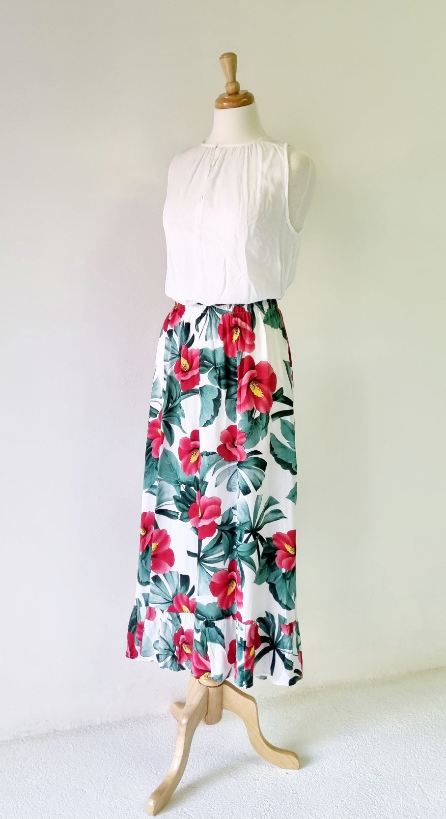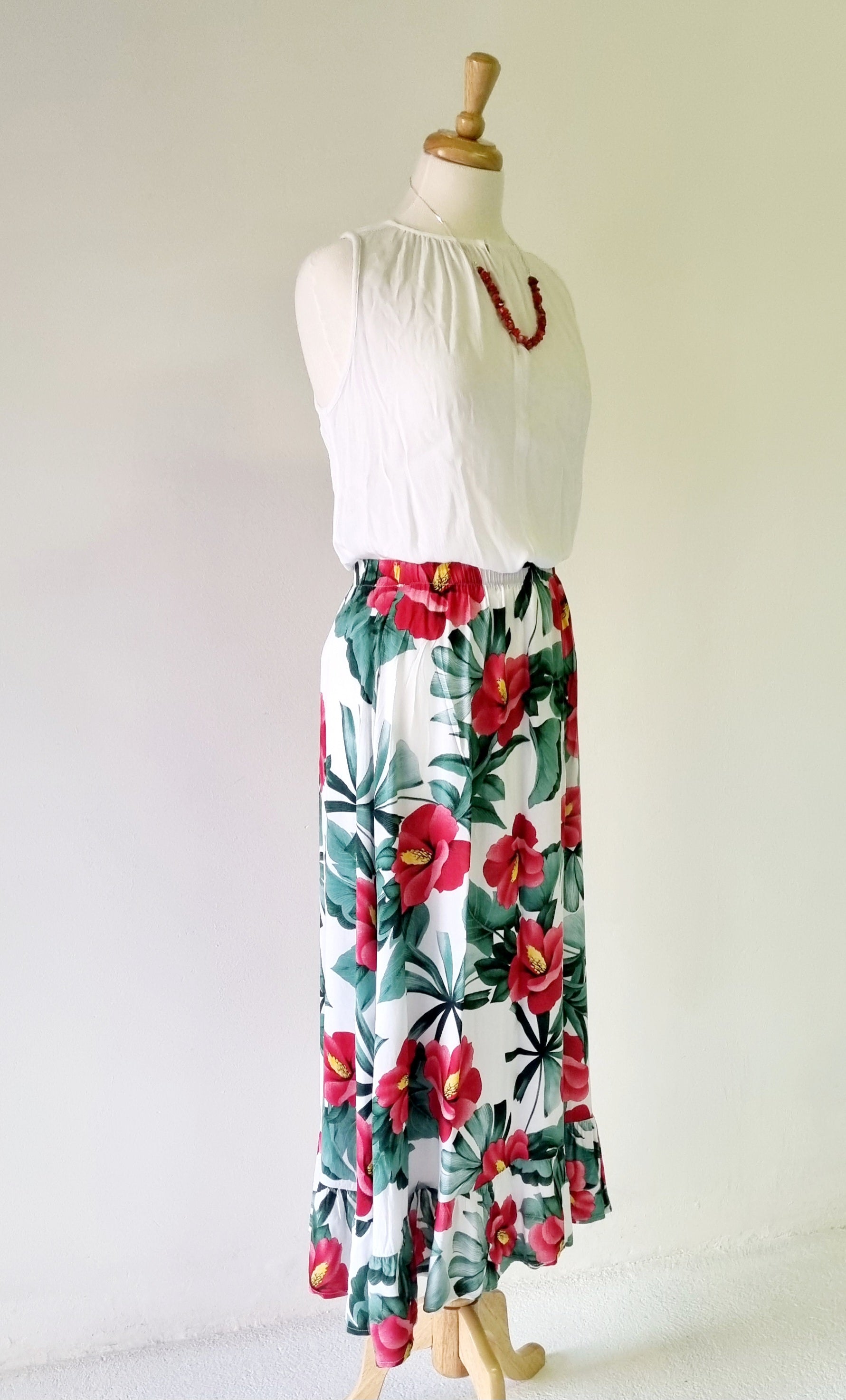 A crisp yet soft red, green & white maxi summer skirt with elasticized waistband and frilled hem.