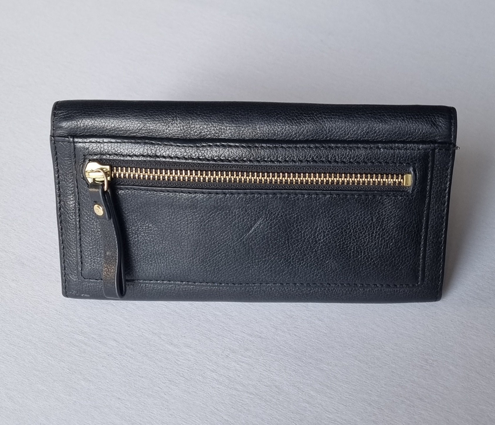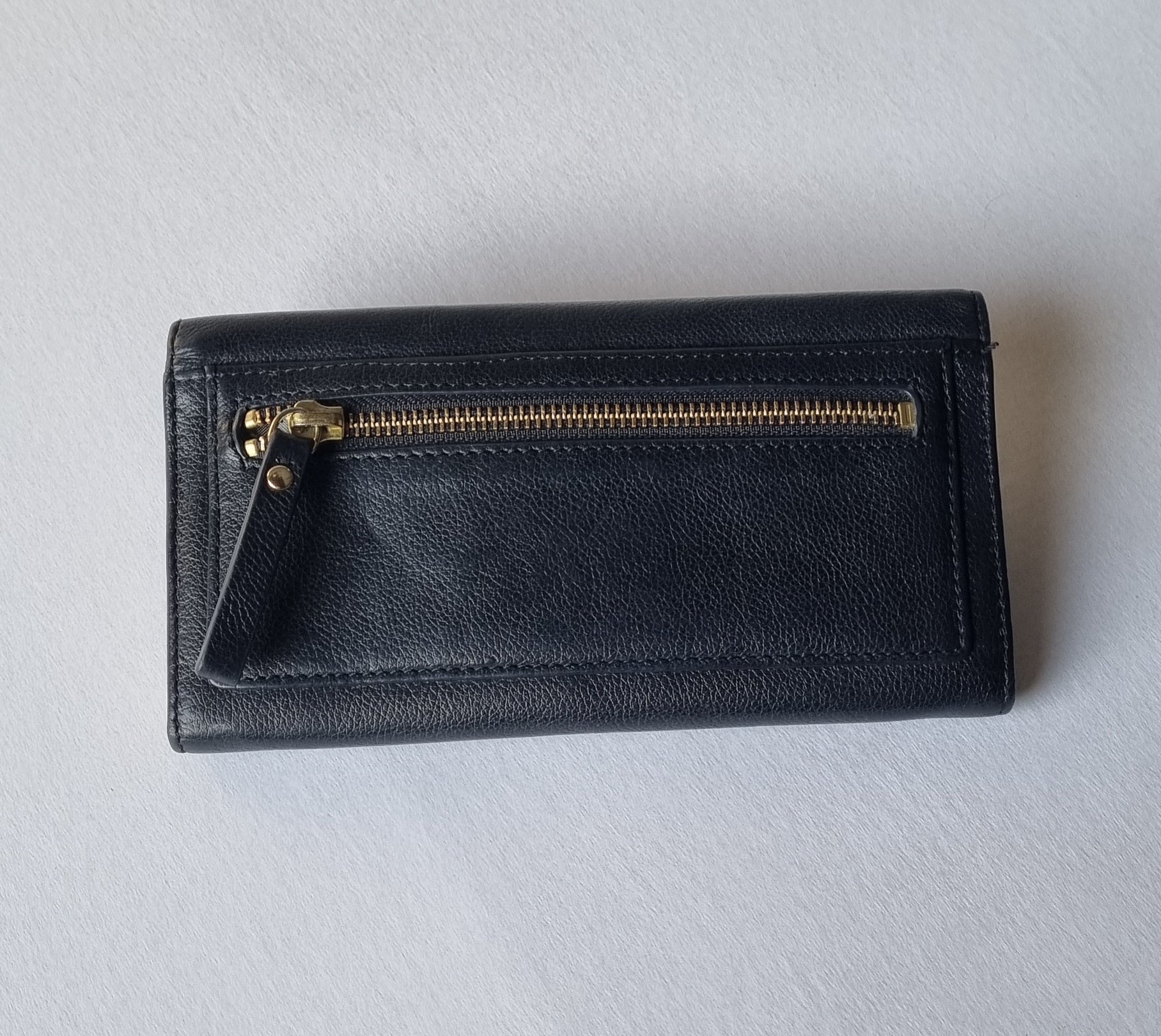 A multi card black leather bi fold clutch wallet with gold inner lining and fastener. It boasts of many internal card slots and zip pocket, with an extra rear zipper compartment. Its main feature would undoubtedly be the classic gold turn lock. A unique addition to your everyday handbag. With tag price of $199.00