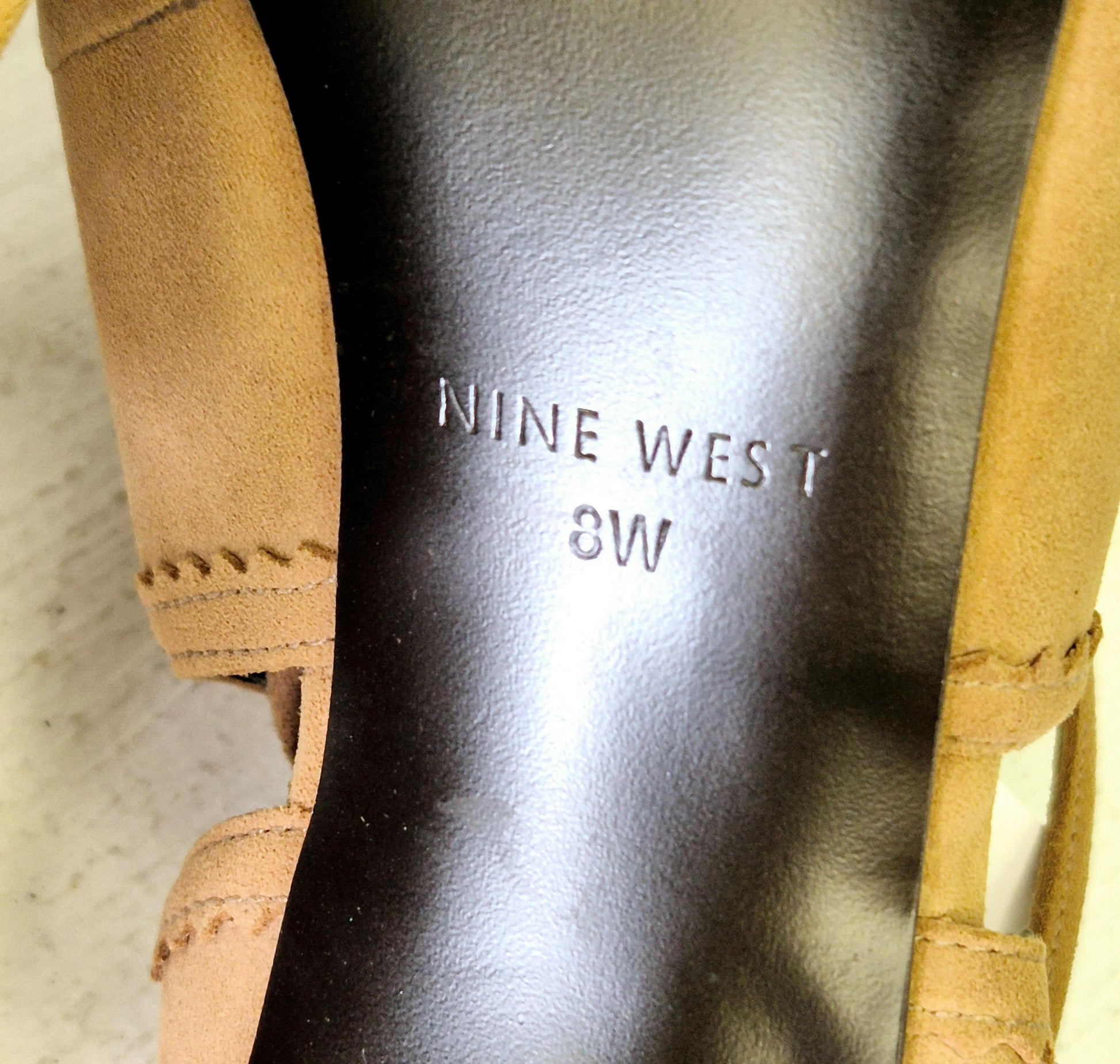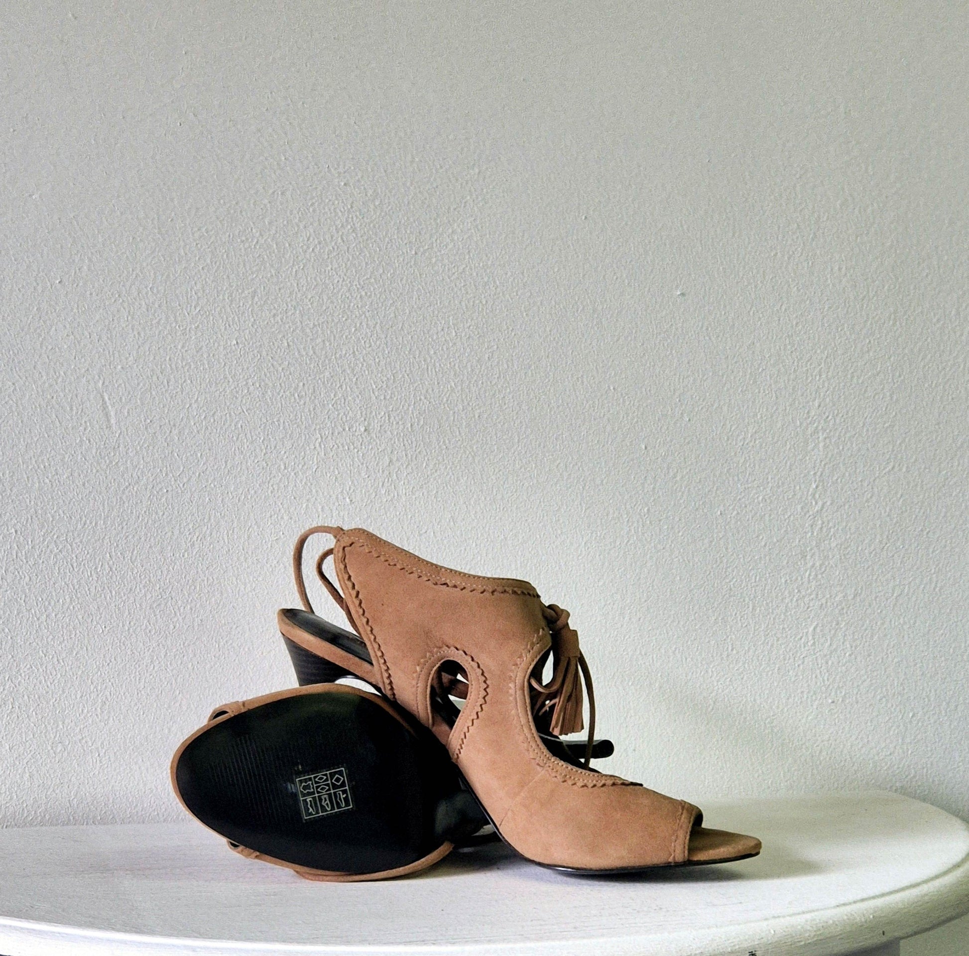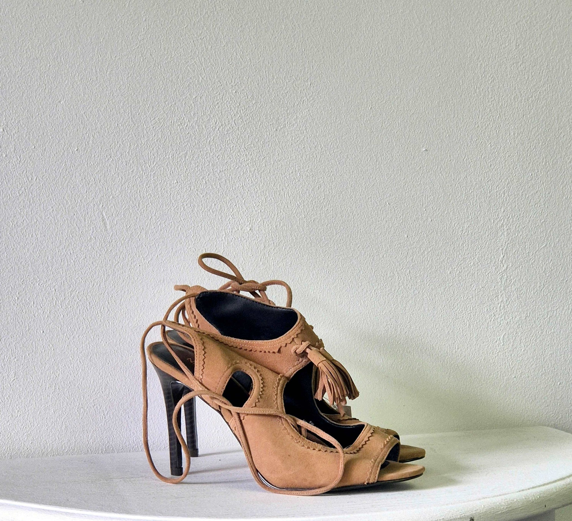 Beige Suede Slingback Peep-toe Heeled Sandal with wrap around leather straps. Heels 10.5cm. 8W