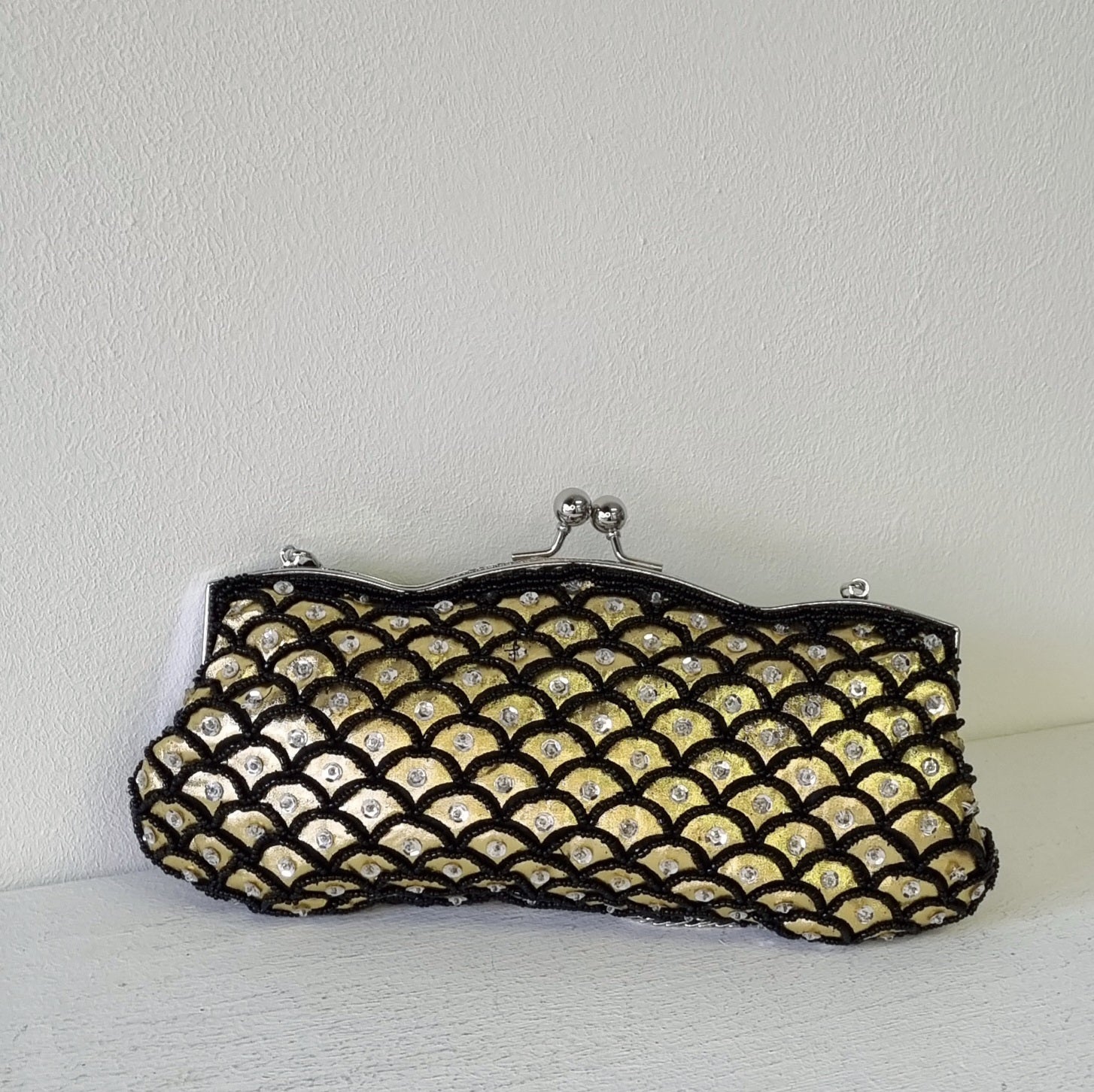 A beautiful gold fabric clutch bag embellished with black beads, silver sequence, a silver kiss clasp and Vintage chain. A perfect addition for that evening outfit.