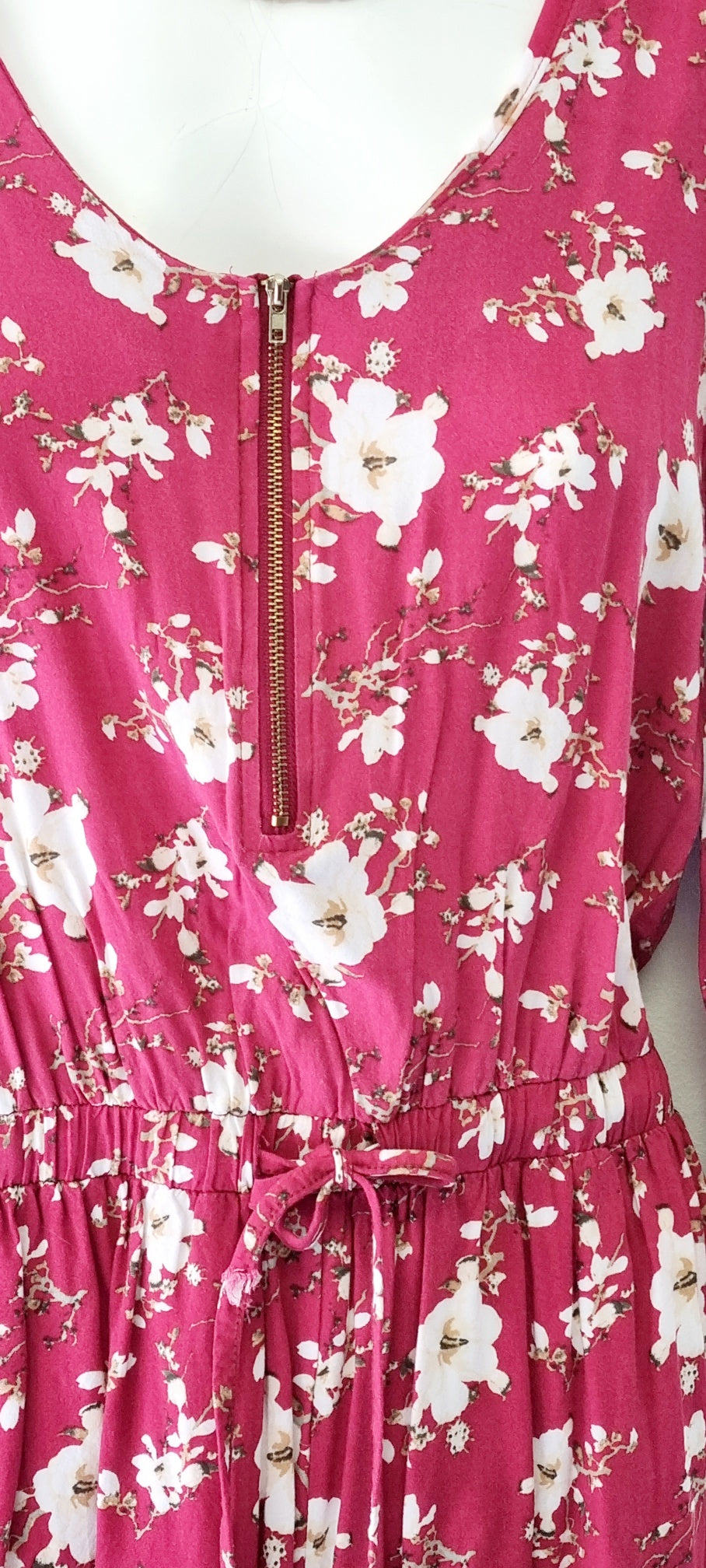 Red and beige rue21 summer romper shorts with front zip, waist tie and tie back 3/4 sleeves.