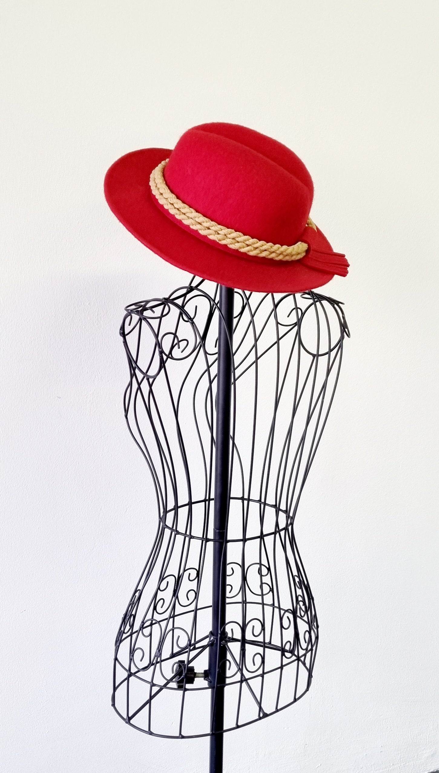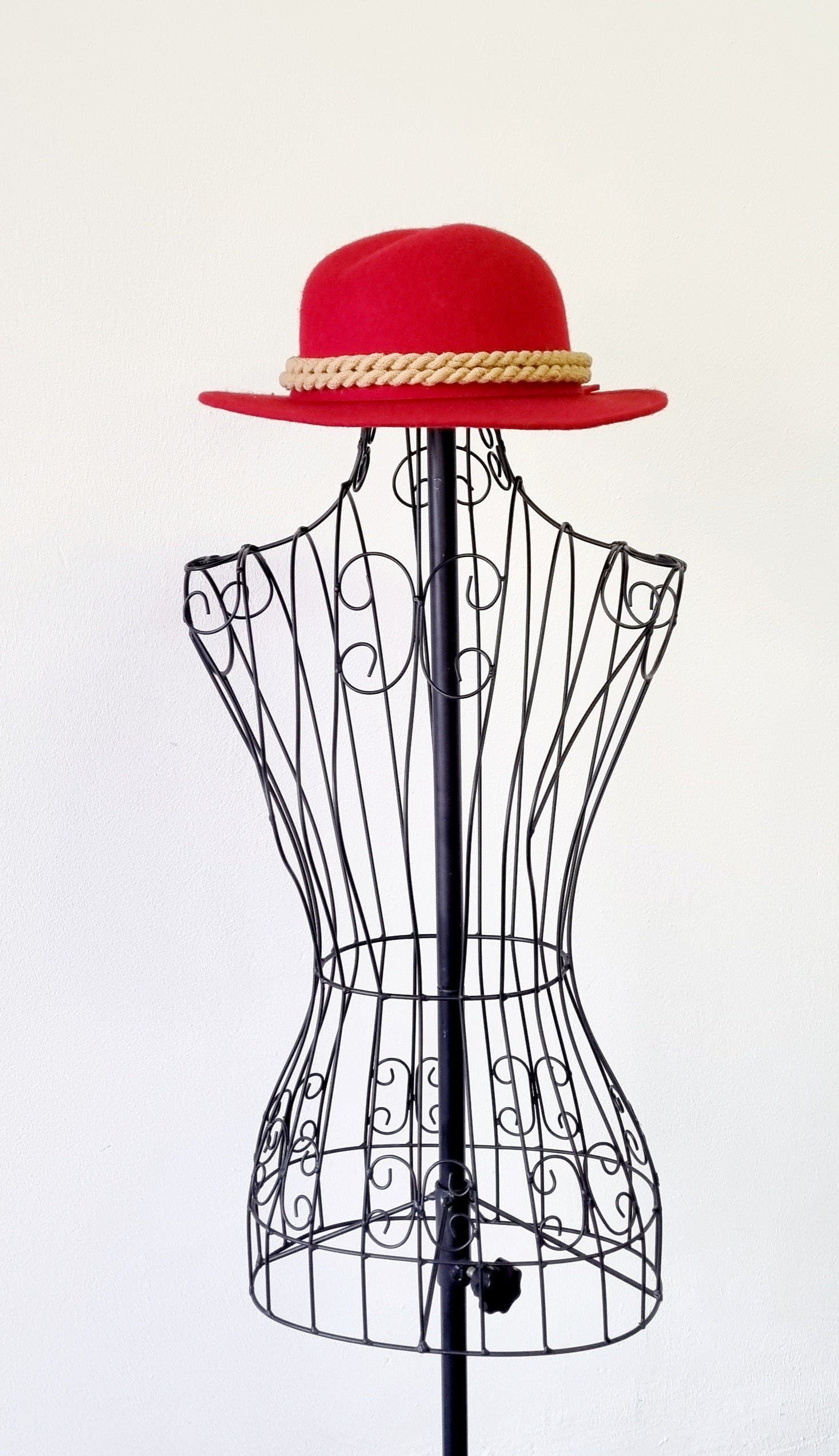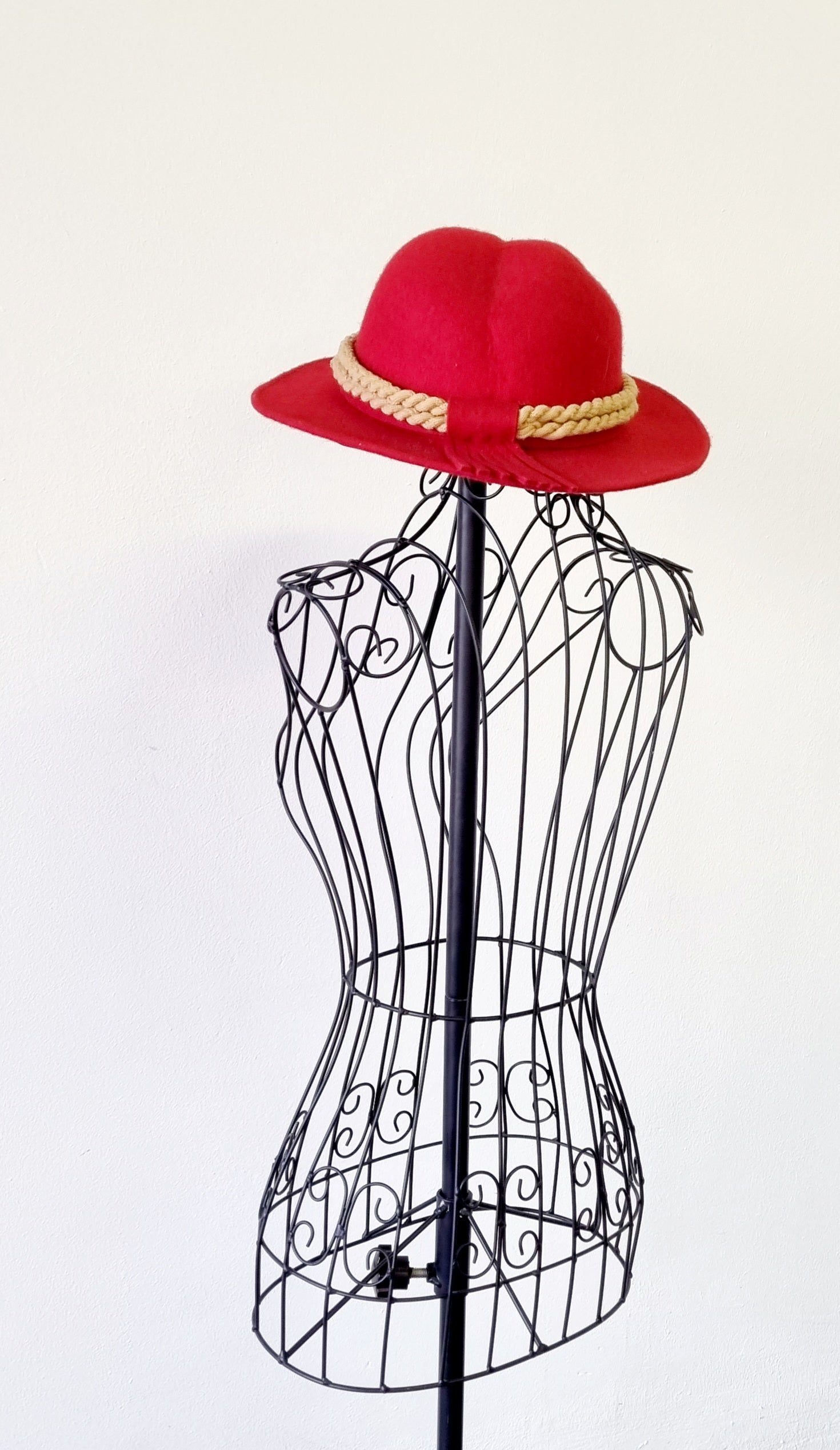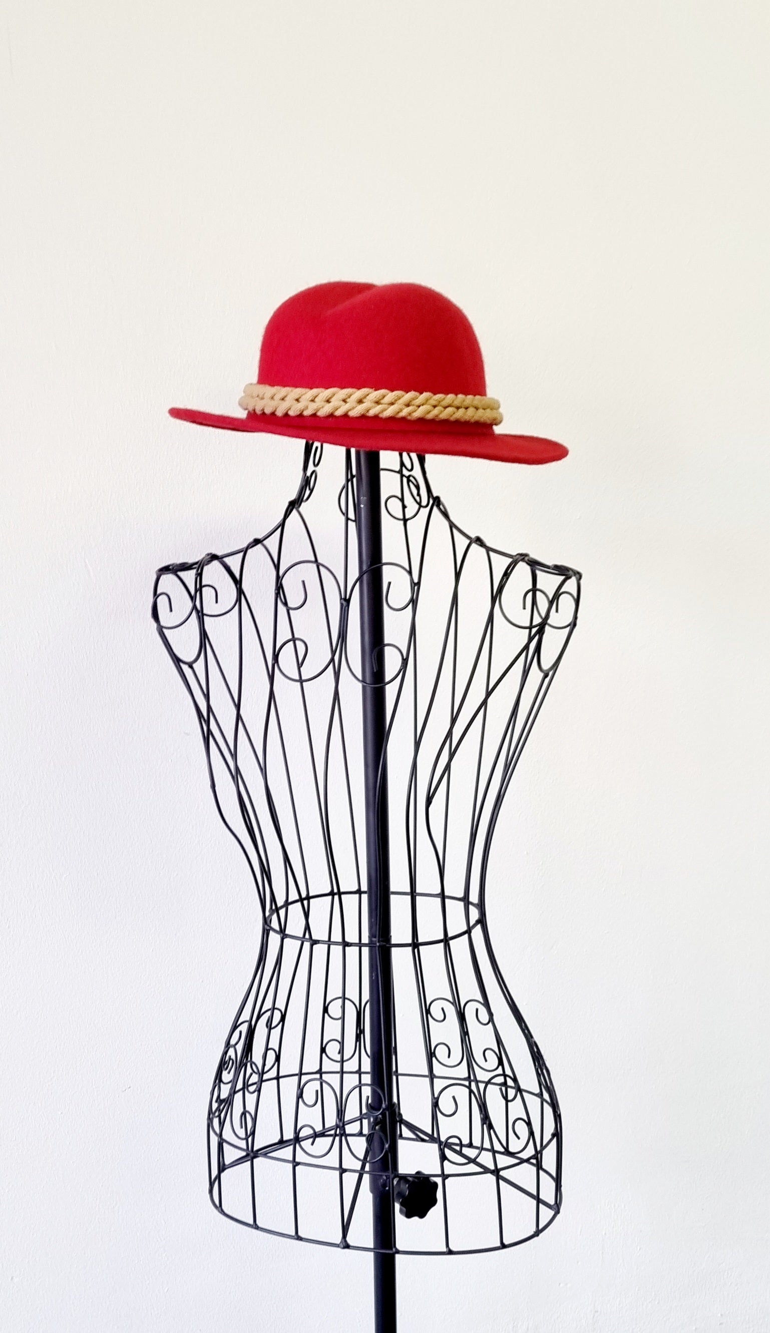 Accessorize your outfit with this gorgeous red felt Fedora hat with rope brim trimming. It is unique, and will enhance your silhouette and outfit.