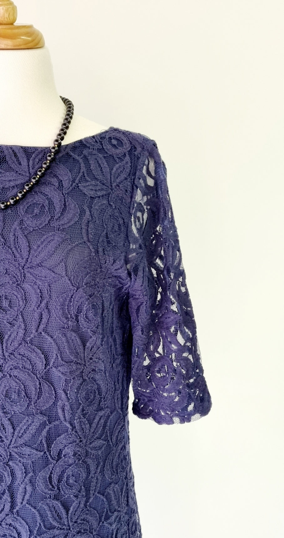 A laced lined blue cotton dress with 3/4 sleeves and back zip.