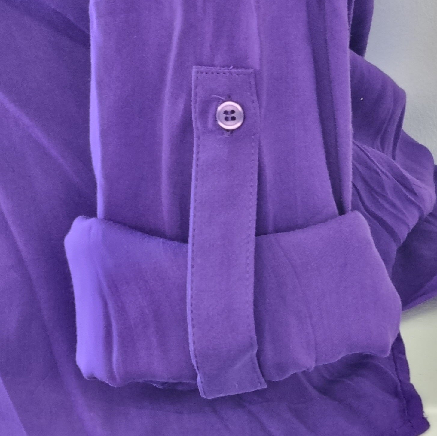 A striking purple roll sleeve collar shirt with hi-lo hem and side slits. Pair with white to pop its gorgeous color!